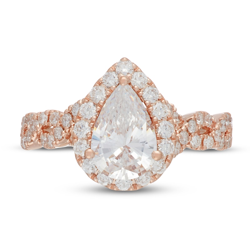This elegant ring from the Neil Lane Bridal®collection features a dazzling 1 1/2 carat pear-shaped diamond at its center, haloed by bright round diamonds. More round diamonds line each side of the twisted band for a total diamond weight of 2 1/8 carats. The ring is fashioned in 14K rose gold.