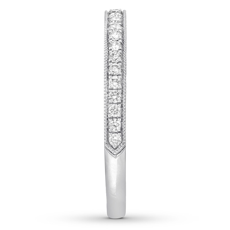 Designed to accompany the matching Neil Lane Studio engagement ring (sold separately), this wedding band is fashioned with sparkling round diamonds in 14K white gold. Milgrain edging completes the look. The ring has a total diamond weight of 1/4 carat.