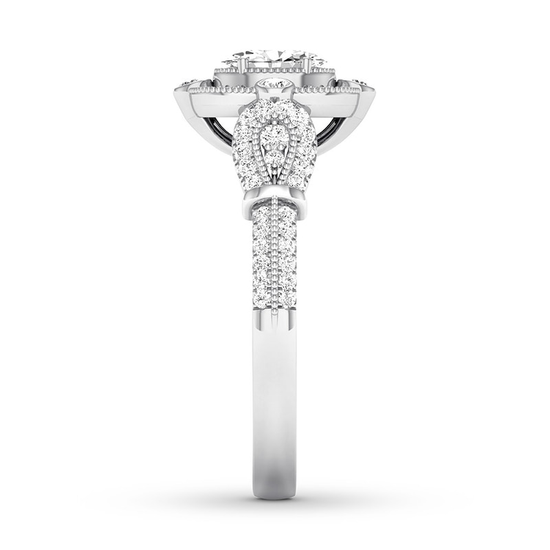 Inspired by vintage styles yet completely modern, this eye-catching engagement ring features a sparkling oval-shaped diamond center framed in an ornate array of round diamonds and milgrain beading. Shimmering loops of diamonds create each side of the band to complement, bringing the total diamond weight to 3/4 carat. The ring is crafted of 14K white gold.