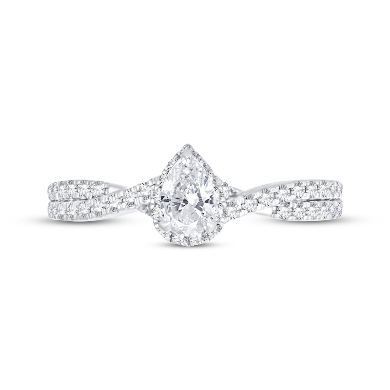 This gorgeous diamond engagement ring for her features an exquisite pear-shaped diamond at its center, framed by brilliant round-cut diamonds. More round diamonds twist down the 14K white gold band, giving the ring a total diamond weight of 3/4 carat. From the Now & Forever® bridal collection.