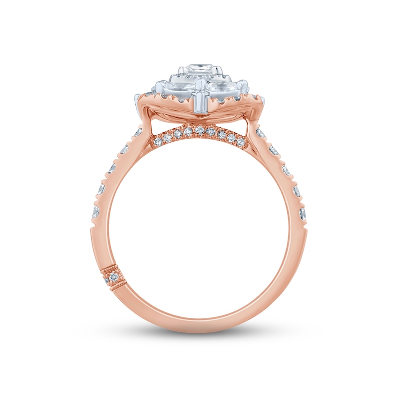 This ravishing engagement ring showcases a 1/3-carat princess-cut diamond traced by dainty round diamonds and styled in 18K white gold at the center. Marquise and round-cut diamonds create a subtly clover-shaped design crafted in 18K rose gold. Brilliant round diamonds grace the band and twinkle along the bridge, bringing the total diamond weight to 1 3/8 carats. The independently certified center diamond is laser-inscribed with a unique Gemscribe® serial number to ensure your peace of mind. From the Monique Lhuillier Bliss collection, available exclusively at KAY. Please note: This ring is available in limited sizes. If you don't see your size here, please visit a store to order your ring.