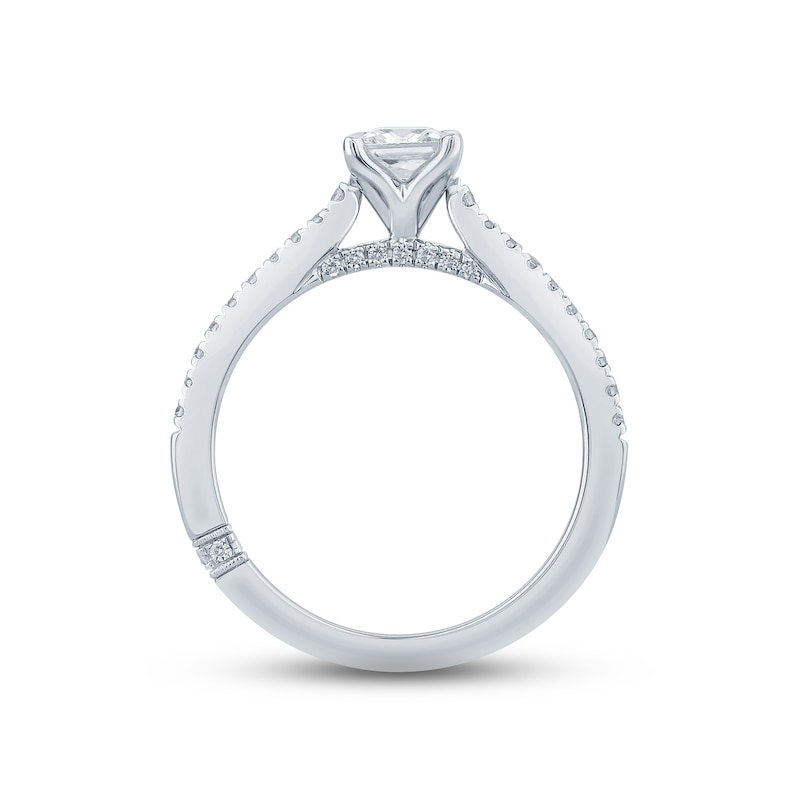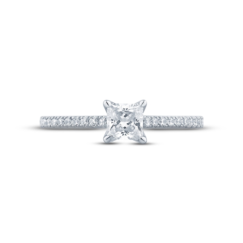 A gorgeous 1/2-carat princess-cut diamond draws the eye to this sublime and sparkling engagement ring. Brilliant round-cut diamonds grace the band and shine across the bridge, giving the ring a total diamond weight of 5/8 carat. The band is crafted in 18K white gold and is finished by classic milgrain detailing. The independently certified center diamond is laser-inscribed with a unique Gemscribe® serial number to ensure your peace of mind. From the Monique Lhuillier Bliss collection, available exclusively at KAY. Please note: This ring is available in limited sizes. If you don't see your size here, please visit a store to order your ring.