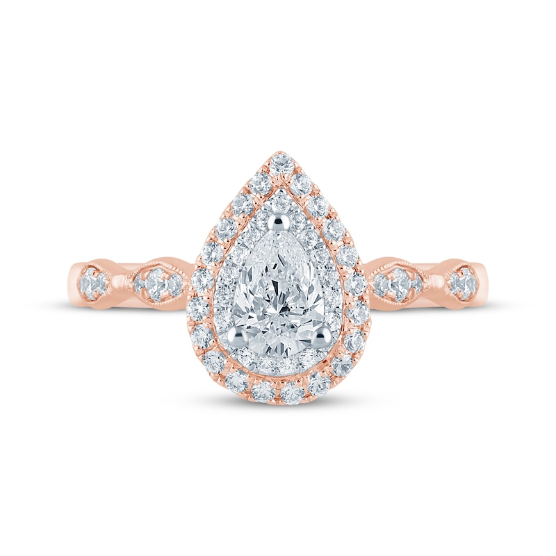 • The centerpiece is a beautiful 1/3-carat pear-shaped diamond sparkling within two halo frames of round-cut diamonds