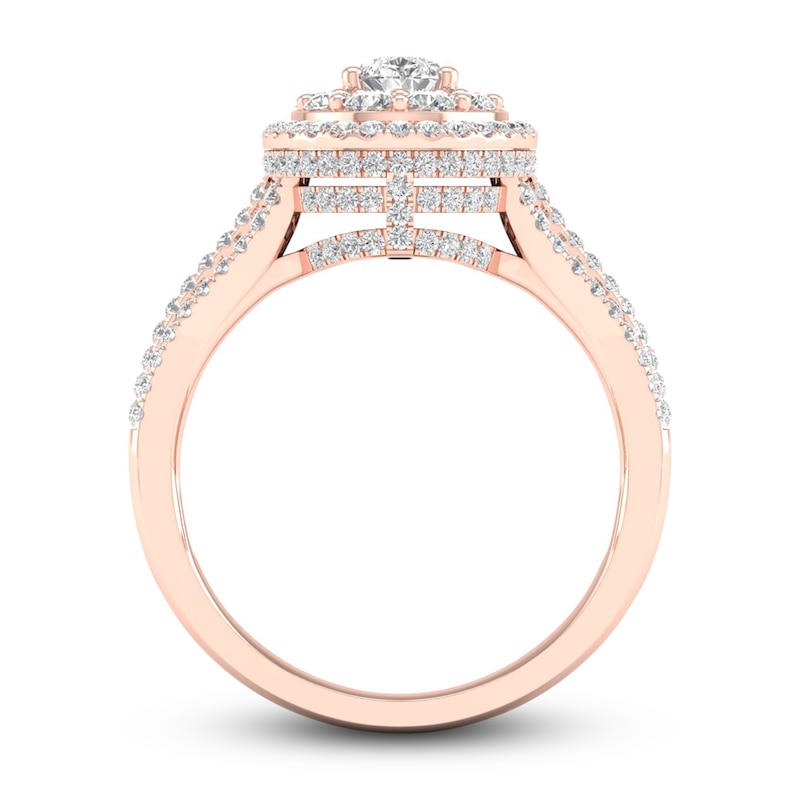 They'll be swept away (and say YES!) with the breathtaking sparkle of this diamond engagement ring. An exquisite pear-shaped diamond forms a remarkable focal point when embraced with duo halos of shimmering round-cut diamonds. For a delightful finish, three ribbons of radiant round diamonds form the magnificent polished 14K rose gold setting. The ring has a total diamond weight of 1 1/5 carats and is from our Now & Forever® bridal collection.