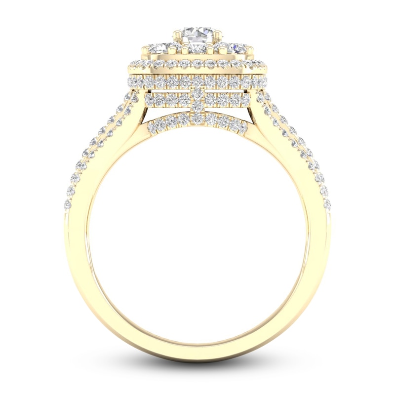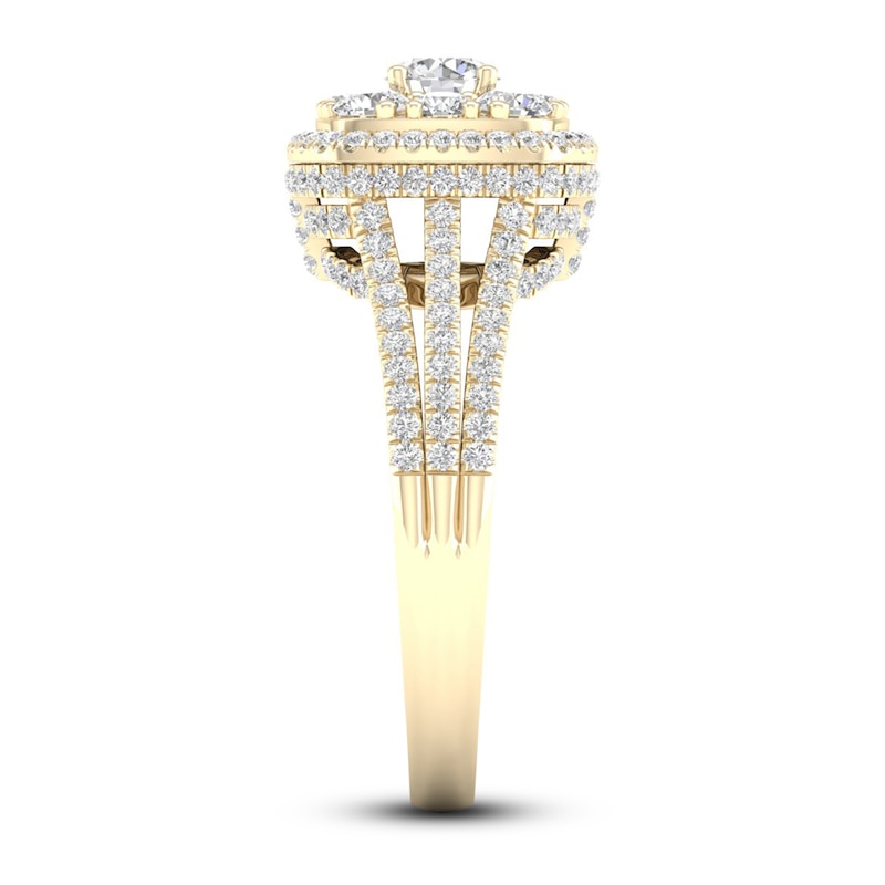 This beautiful multi-diamond engagement ring sparkles with a stunning array of round diamonds at its center, set in timeless 14K yellow gold. Brilliant round diamonds halo the center design and shimmer down the band in multiple rows for a total diamond weight of 1 1/5 carats. From the Now & Forever® bridal collection.