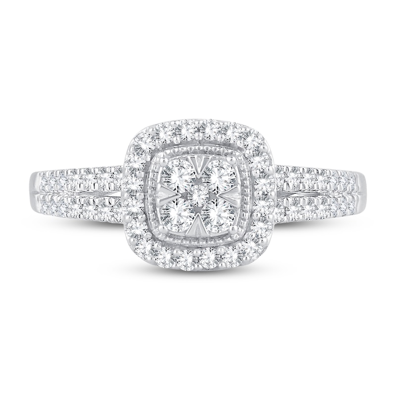 A beautiful cluster of brilliant round diamonds forms the cushion-shaped center in this classic engagement ring for her. Set in chic 10K white gold, sparkling round diamonds halo the center, and more shimmer down the band in two rows. The ring has a total diamond weight of 1/2 carat, and milgrain detailing finishes the look. From the Now & Forever® bridal collection.