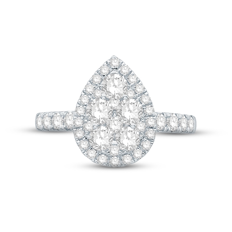 A dazzling cluster of round-cut diamonds comprises the pear-shaped center of this sophisticated engagement ring. Delicate round-cut diamonds trace the center, and more round diamonds adorn the 14K white gold band. The ring has a total diamond weight of 1 3/8 carats. From the Now and Forever® bridal collection.