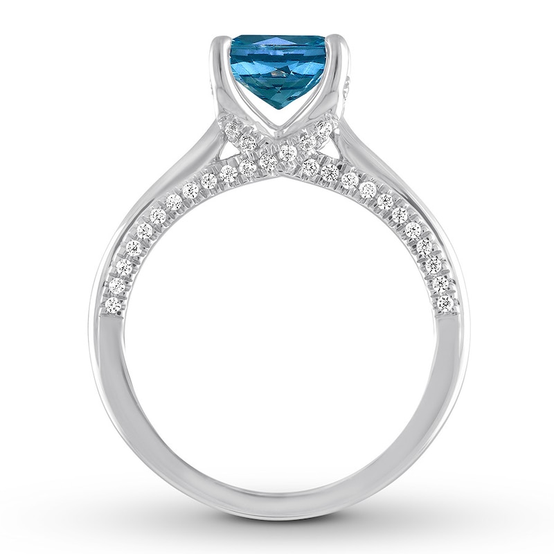 This modern engagement ring offers a fresh take on the classic solitaire design with a stunning cushion-cut blue topaz center. Sparkling round diamonds sweep along the sides of the band toward the center to complement. Fashioned in 14K white gold, the ring has a total diamond weight of 1/4 carat.