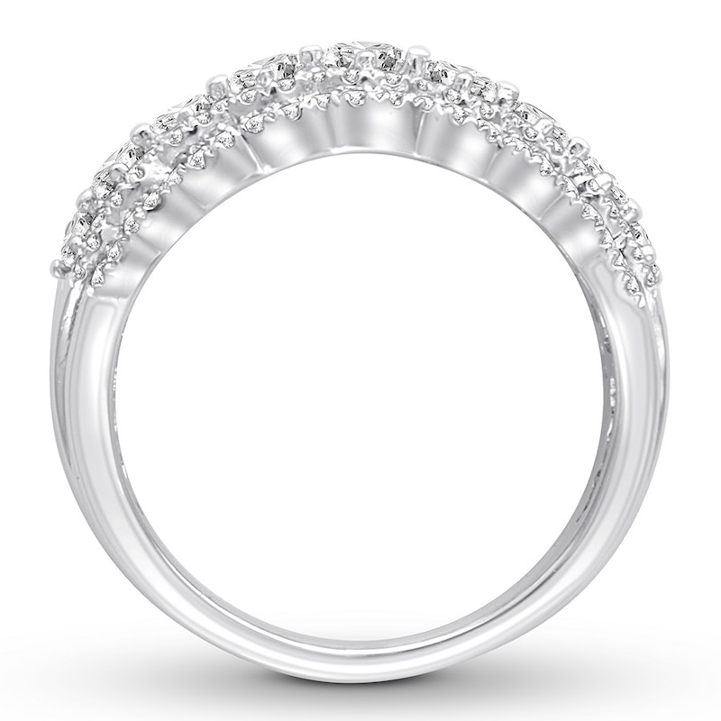 A meaningful gift is a wonderful way to mark another year of love. This impressive anniversary band showcases a dazzling row of round diamonds lined above and below by sparkling curves of diamonds. Fashioned in polished 14K white gold, the ring has a total diamond weight of 1 carat. From the Now & Forever® Bridal Collection.