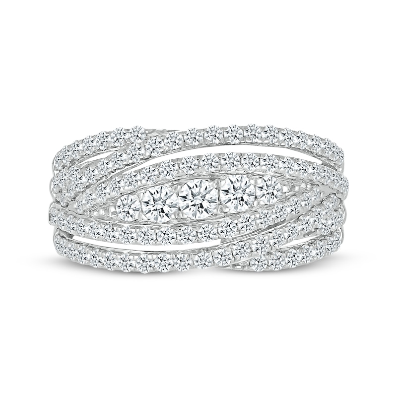 This fabulous crossover ring showcases sparkling rows of round diamonds that swoop around a center array of five radiant round diamonds. The ring is crafted in 10K white gold and has a total diamond weight of 1 carat.