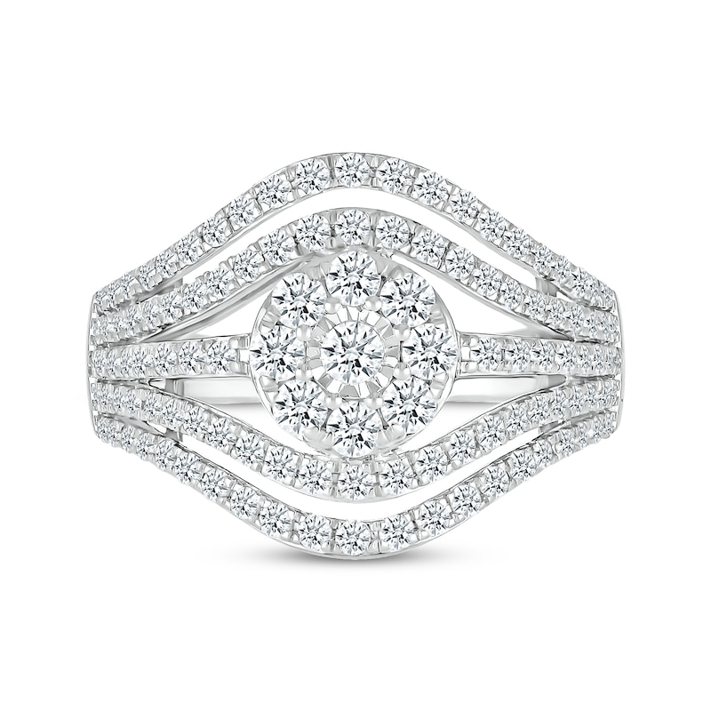 This dazzling ring displays multiple rows of round diamonds that sweep along the wide band, which is contoured on top and bottom. A bright cluster of round diamonds shimmers at the center, drawing the eye and giving the stylish 10K white gold ring a total diamond weight of 1 carat.