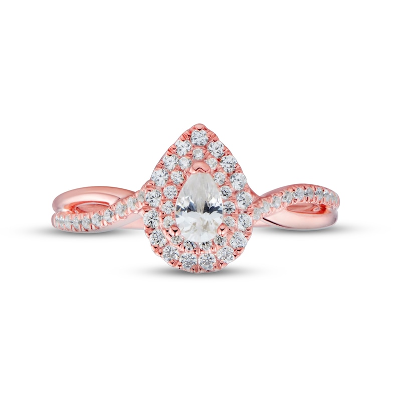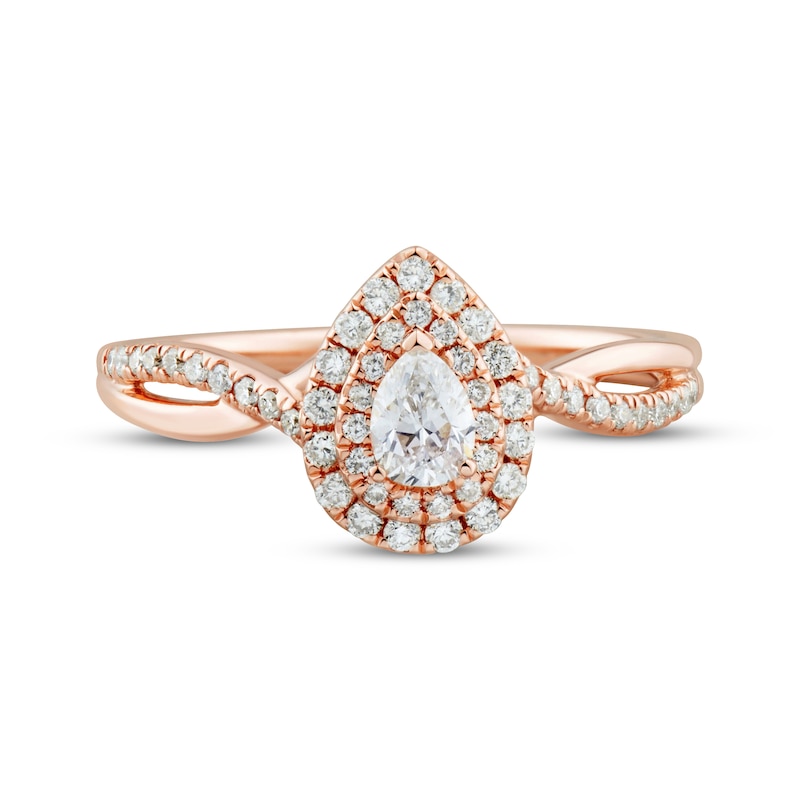 This enchanting engagement ring for her features a stunning pear-shaped diamond at its center, surrounded by two rows of brilliant round-cut diamonds. More round diamonds weave down the sides of the band, and beautiful bezel-set round-cut diamonds peek out underneath for a total diamond weight of 1/2 carat. The ring is set in beautiful 14K rose gold. From the Now & Forever® bridal collection.