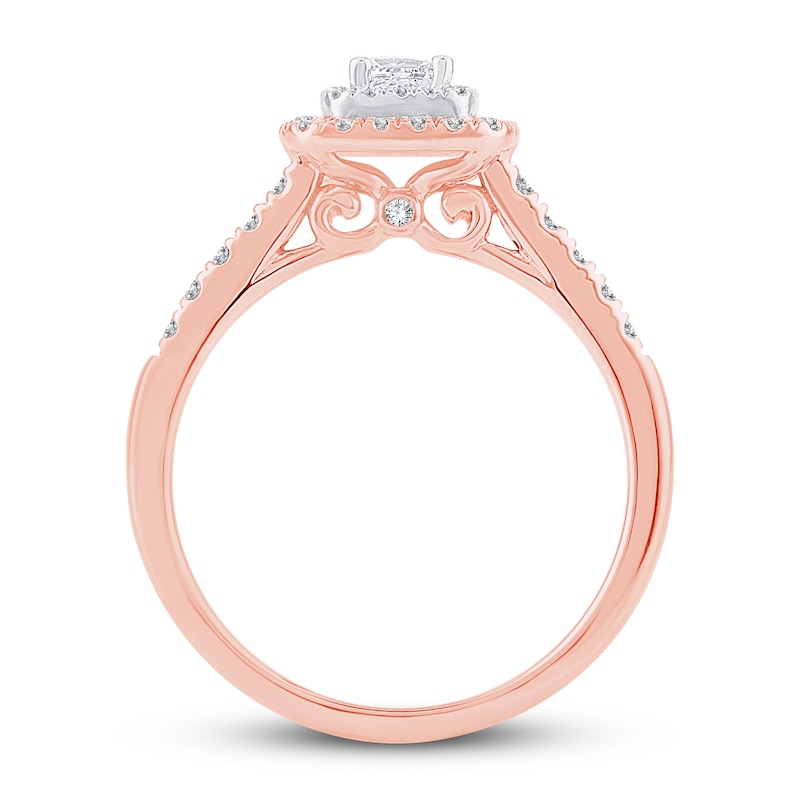 A stunning princess-cut diamond sparkles at the center of this beautiful engagement ring for her. Set in a rhodium flash, brilliant round-cut diamonds halo the center stone. More round diamonds frame the outer edge and stream down each side of the 14K rose gold band, while two bezel-set diamonds sparkle under the center setting for a total diamond weight of 1/2 carat. From the Now & Forever® bridal collection.