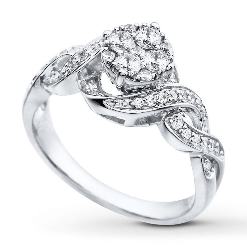 A bouquet of dazzling diamonds sparkles at the center of interwoven ribbons of 10K white gold and diamonds in this thrilling engagement ring for her. The lovely ring has a total diamond weight of 1/2 carat.