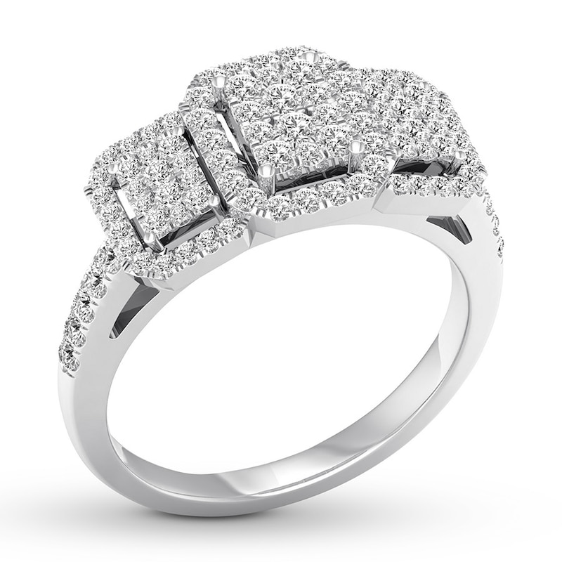 Shimmering round diamonds enliven the bold geometric design of this engagement ring, inspired by three-stone designs. Crafted of 10K white gold, the ring has a total diamond weight of 1/2 carat.