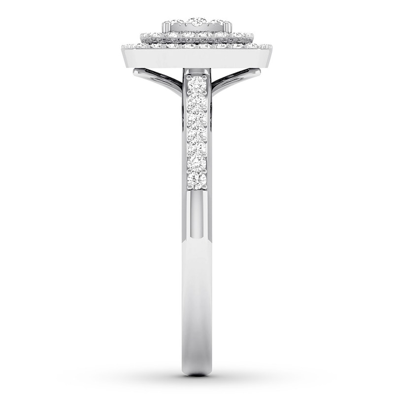 Sparkling round diamonds are arranged in a stylish halo design in the center of this eye-catching engagement ring. Fashioned in timeless 10K white gold, the ring has a total diamond weight of 1/2 carat.