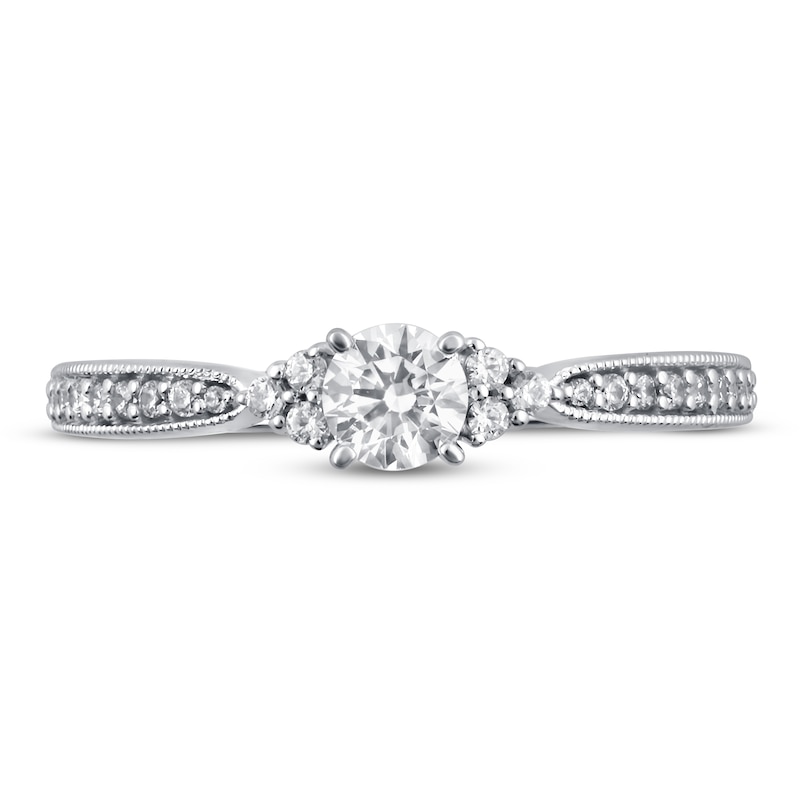 A stunning round-cut diamond sparkles at the center of this diamond engagement ring for her. Trios of round-cut diamonds flank the center stone, and more round diamonds line each side of the 14K white gold band for a total diamond weight of 1/2 carat. The band features milgrain detailing to finish the classic look. From the Now & Forever® bridal collection.