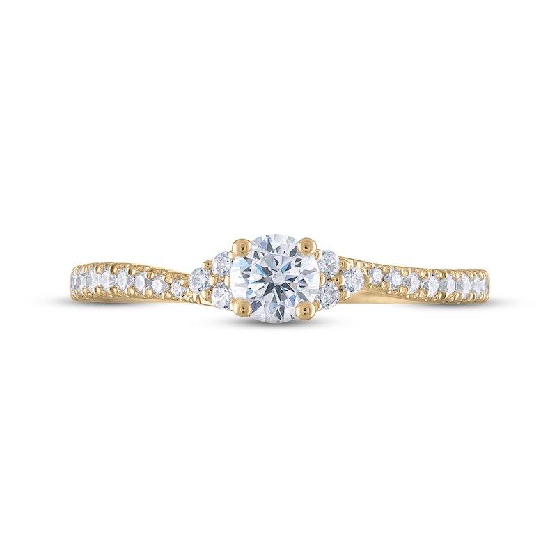 This exquisite engagement ring for her showcases a brilliant 1/3-carat round diamond at the center. Trios of radiant round diamonds sparkle at the flanks, and delicate round diamonds adorn the gently contoured band. Styled in classic 14K yellow gold, the ring has a total diamond weight of 1/2 carat. From the Now and Forever® bridal collection.