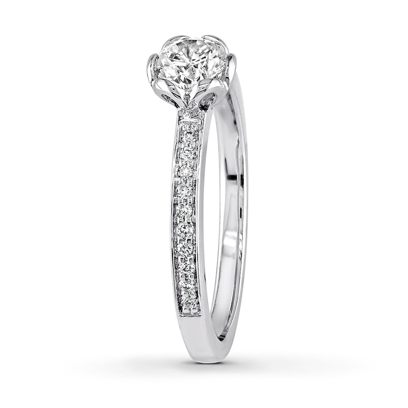 The center of this enchanting engagement ring features a sparkling round diamond surrounded by petal-like curves of 14K white gold. Smaller round diamonds dance along the band, bringing the total diamond weight of the ring to 1/2 carat.