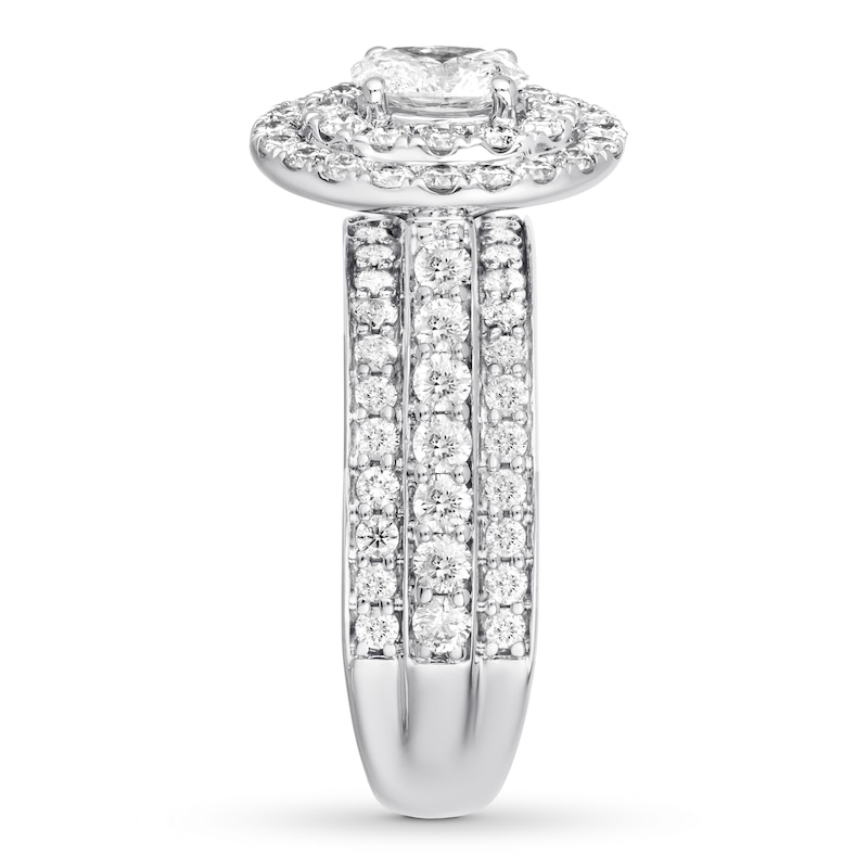 Declare your love with this incredible engagement ring. Two rows of round diamonds halo a brilliant 1/2-carat oval diamond in the center, while the generous band shines with more diamonds. The ring is styled in elegant 14K white gold, and the diamonds total 1 7/8 carats in weight.