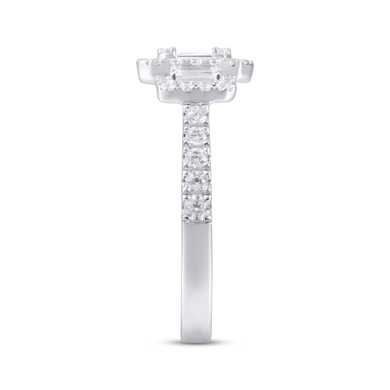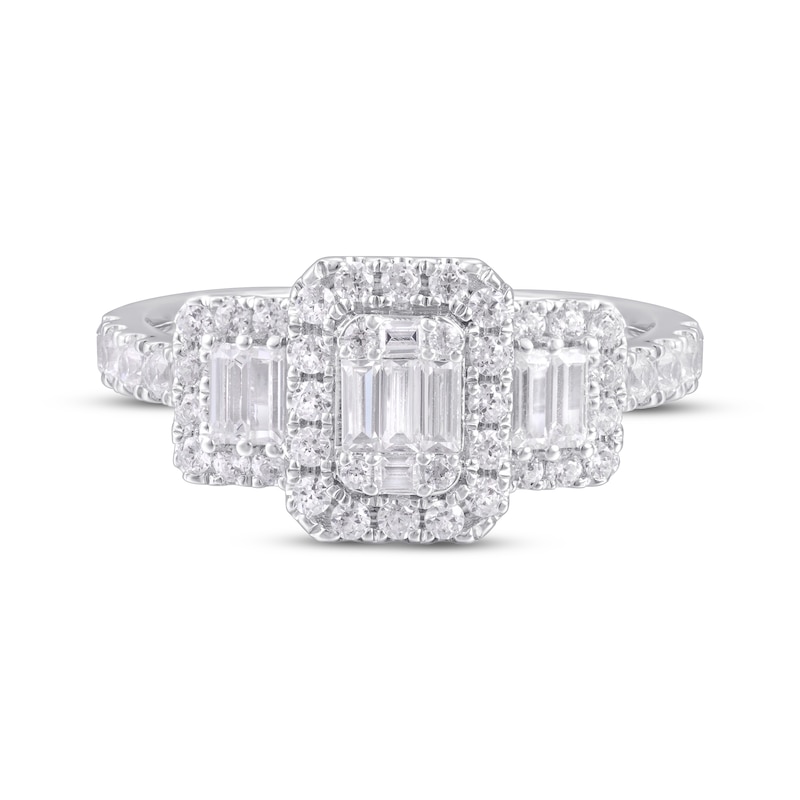A gorgeous design of magnificent baguette-cut diamonds shine at the center of this engagement ring for her. Sparkling round diamonds frame each center diamond and stream down each side of the band for a total diamond weight of 1 carat. The ring is fashioned in 14K white gold. From the Now & Forever® bridal collection.