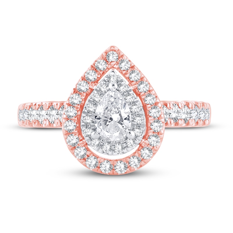 A gorgeous pear-shaped diamond shines at the center of this beautiful engagement ring for her. Set in a rhodium flash, brilliant round-cut diamonds halo the center stone. More round diamonds frame the outer edge and stream down each side of the 14K rose gold band. Two bezel-set round-cut diamonds peek out from under the center design, giving the ring a total diamond weight of 1 carat. From the Now & Forever® bridal collection.
