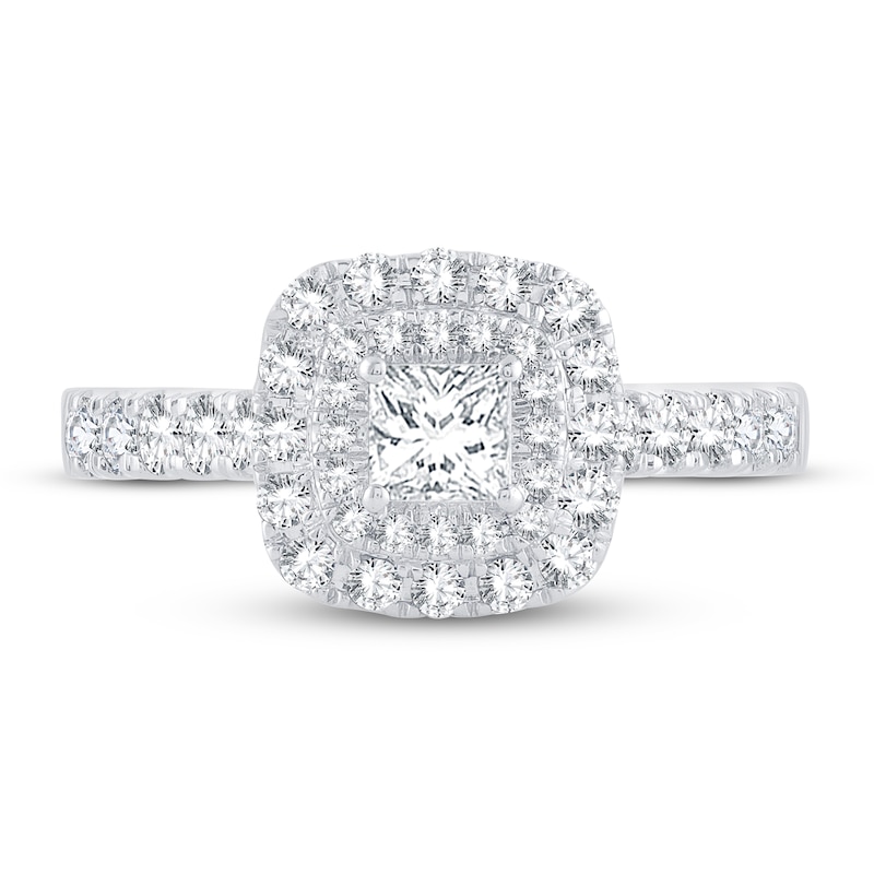 A beautiful princess-cut diamond sparkles at the center of this diamond engagement ring for her. A double halo of brilliant round-cut diamonds frames the center, and more round-cut diamonds dazzle down each side of the 14K white gold band. The ring has a total diamond weight of 1 carat. From the Now & Forever® bridal collection.