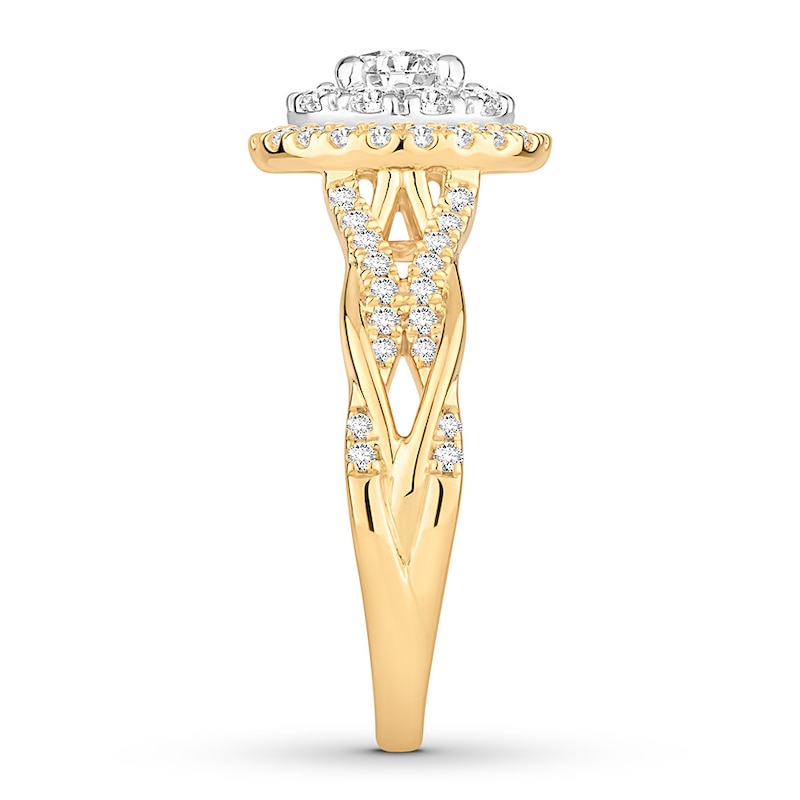 Magical 14K yellow gold brings brilliant round diamonds to life in this marvelous engagement ring. Sparkling diamonds are arranged in a halo design in the center and create a graceful woven design on the band. The ring has a total diamond weight of 1 carat, and the center diamonds are set in 14K white gold.