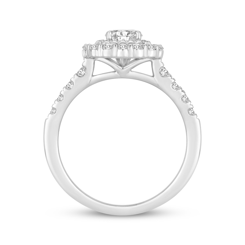 Bold settings and brilliant diamonds create a contemporary design in this stunning engagement ring. The center showcases a 1/2-carat round diamond haloed by two rows of diamonds. The band shines with more diamonds, bringing the total weight to 1 carat. The ring is styled in modern 14K white gold.