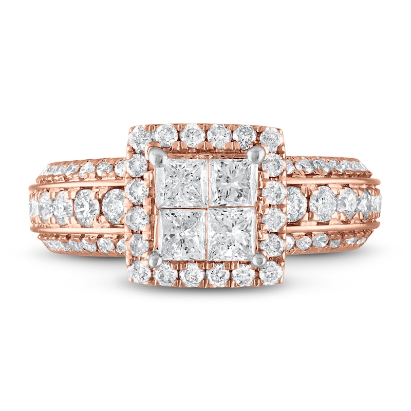 Four gorgeous princess-cut diamonds form the center of this stunning engagement ring for her. A halo of round diamonds frames the center, and three rows of sparkling round diamonds line each side of the band. The 14K rose gold ring has a total diamond weight of 2 carats. From the Now & Forever® bridal collection.