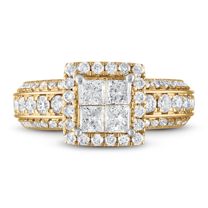 Four gorgeous princess-cut diamonds form the center of this stunning engagement ring for her. A halo of round diamonds frames the center, and three rows of sparkling round diamonds line each side of the band. The 14K yellow gold ring has a total diamond weight of 2 carats. From the Now & Forever® bridal collection.