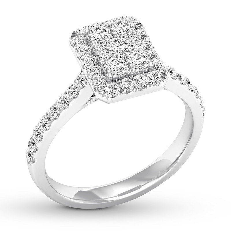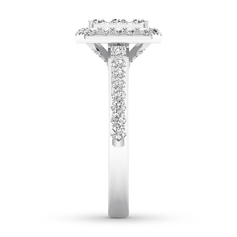 Brilliant round diamonds decorate the rectangular centerpiece of this remarkable engagement ring, crafted of 14K white gold. Diamonds shimmer along the band, bringing the total diamond weight to 3/4 carat.