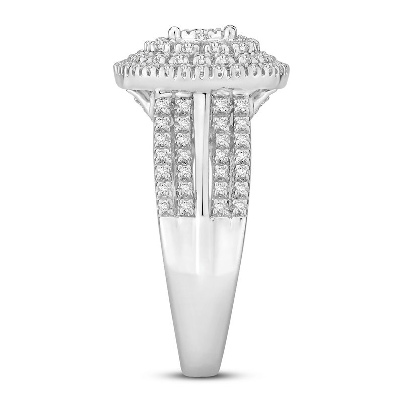 This gorgeous diamond engagement ring for her features a cluster of sparkling round-cut diamonds at its center, surrounded by three rows of more brilliant round-cut diamonds. The 10K white gold band boasts four rows of round diamonds, giving the ring a total diamond weight of 3/4 carat. From the Now & Forever® bridal collection.