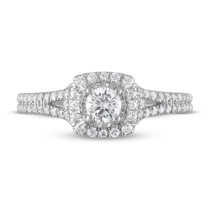 This stunning engagement ring for her is from the Now & Forever® Bridal Collection and features a round diamond that glistens brightly inside a cushion shaped halo of dazzling round diamonds. The band is further enhanced with sparkling round diamonds. Crafted from 14K white gold, the total diamond weight is 5/8 carat.