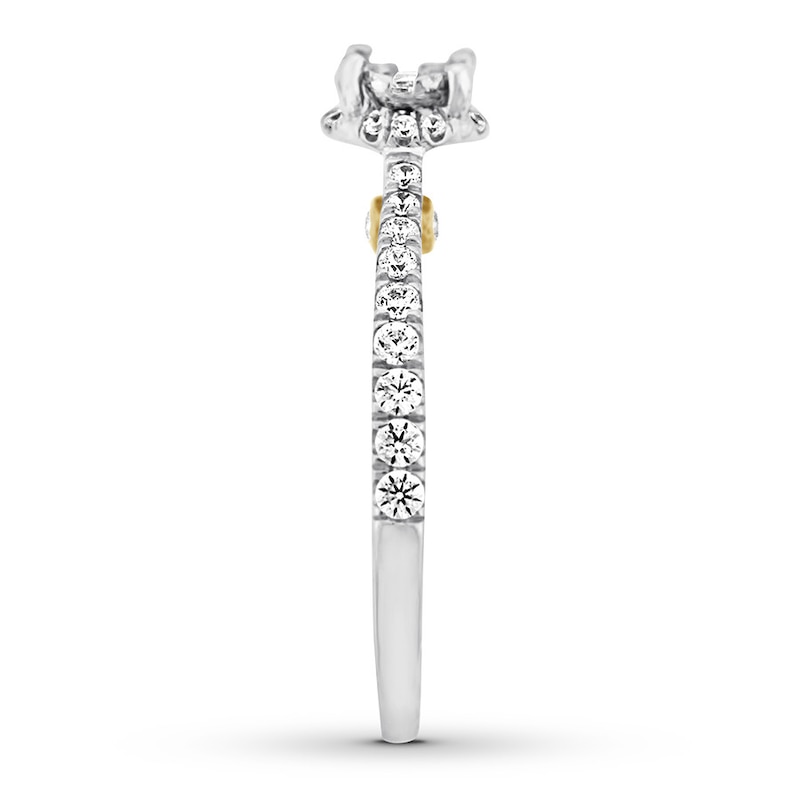 A cluster of tightly nestled round diamonds sparkles at the center of this lovely engagement ring, complemented by more diamonds on the 14K white gold band. A flourishing 14K yellow gold design and bezel-set diamond decorate the inside of the band to complete the design. The ring has a total diamond weight of 5/8 carat. From the Now & Forever® Bridal Collection.