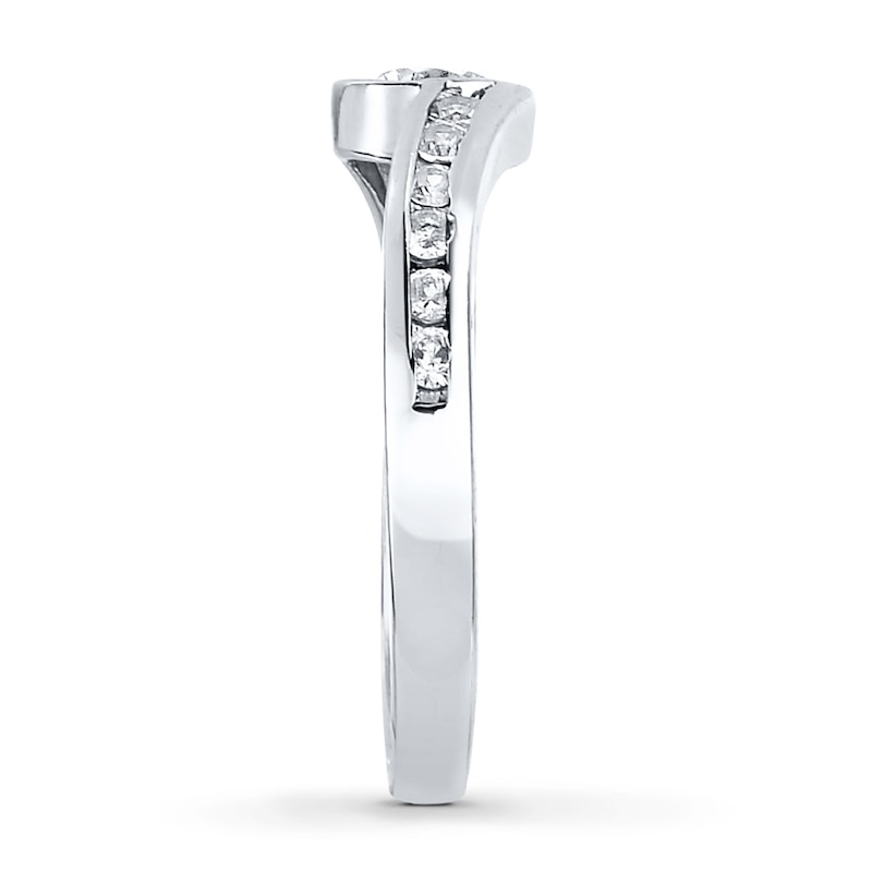 A bezel-set round diamond paired with channel-set round diamonds along the band make this engagement ring for her a modern and marvelous token of your love. The ring is styled in 14K white gold and has a total diamond weight of 5/8 carat.