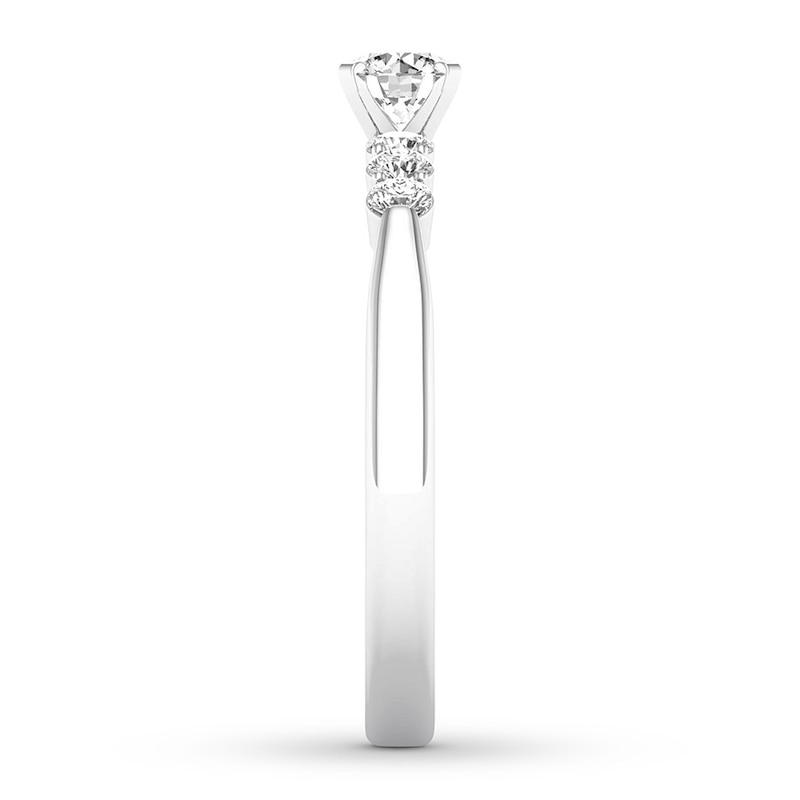 Styled in 14K white gold, this engagement ring is as simple and sweet as the love you share. A 1/2-carat round diamond is beautifully complemented by shimmering round diamonds on each side of the band. The ring has a total diamond weight of 5/8 carat.