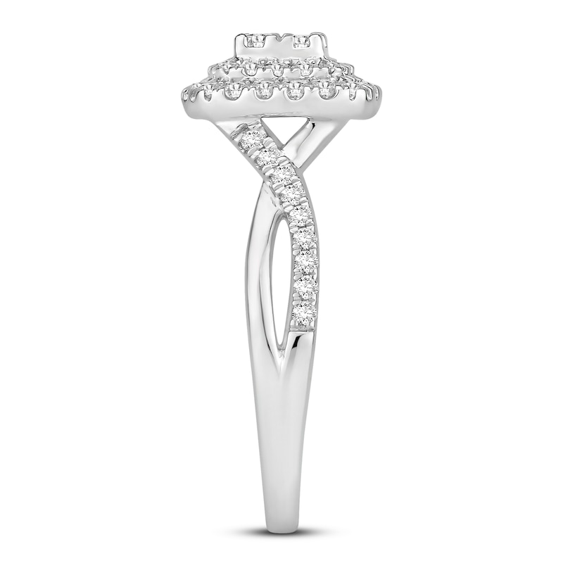 A quartet of sparkling round-cut diamonds forms the center of this beautiful diamond engagement ring for her. The ring features a double halo of round-cut diamonds, and more round-cut diamonds sparkle down its twisted band. The 10K white gold ring has a total diamond weight of 5/8 carat. From the Now & Forever® bridal collection.